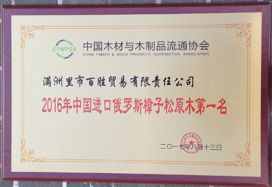 为表彰其取得的成绩,特颁发了《2016年中国十大俄罗斯木材进口商》《2016年进口俄罗斯木材单品种第一名》